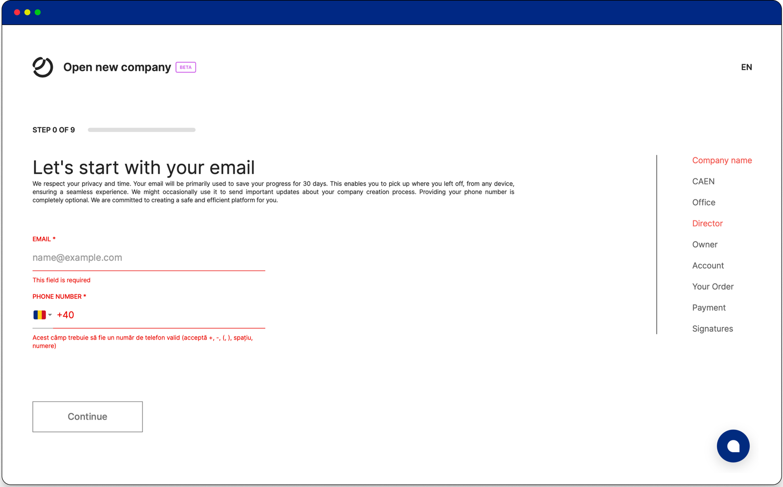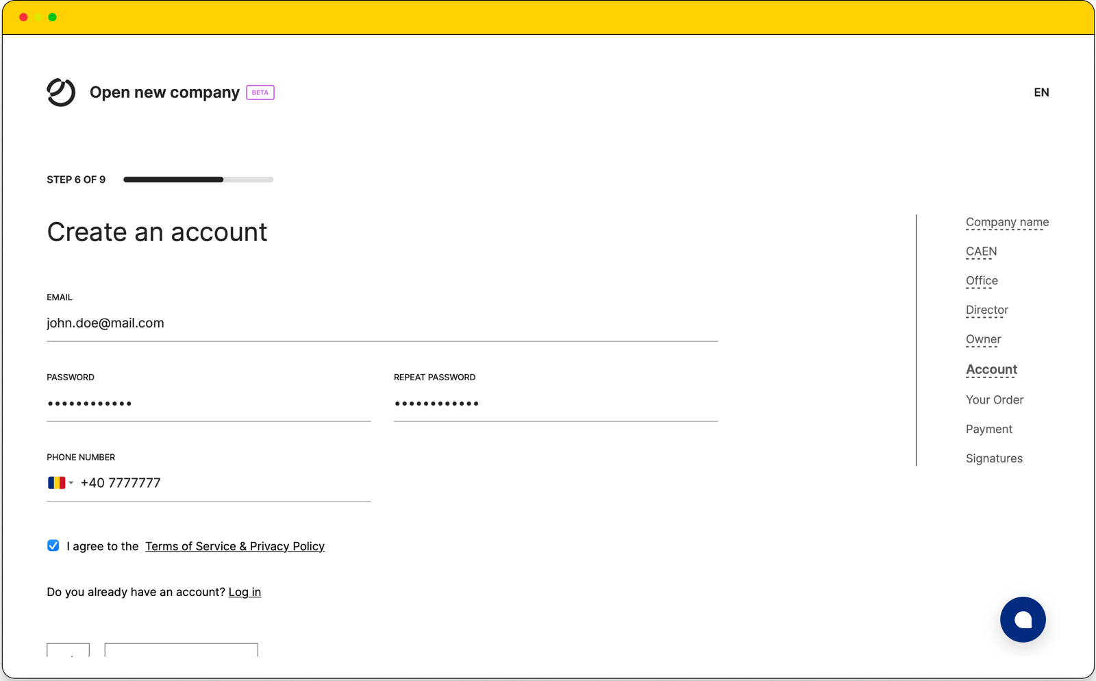Create your Incorpo.ro account to manage your order. Sign up with an email, set a password, and optionally provide a phone number while agreeing to our Terms of Service & Privacy Policy.