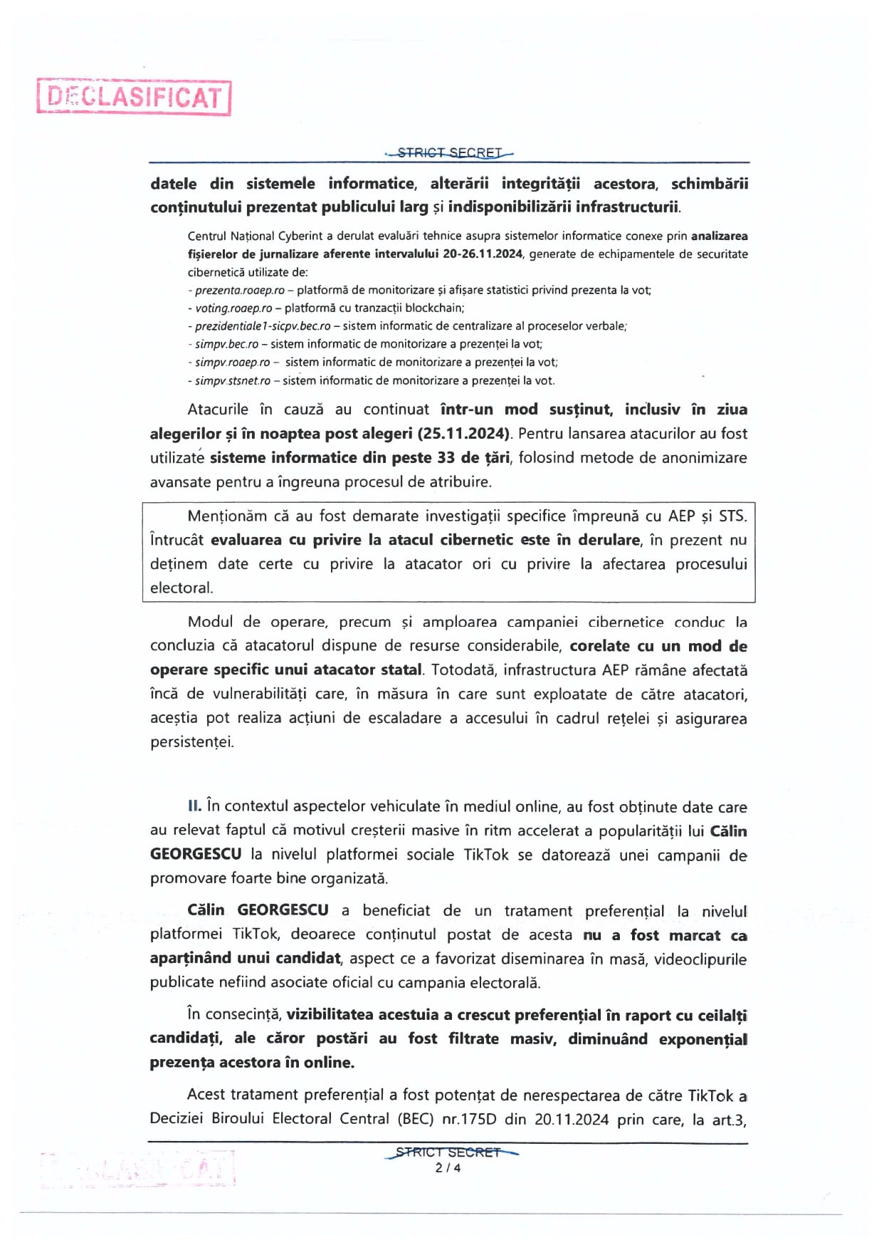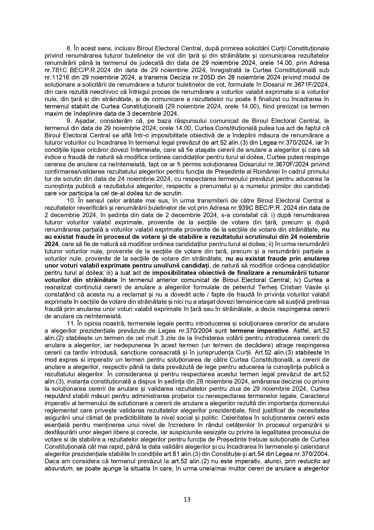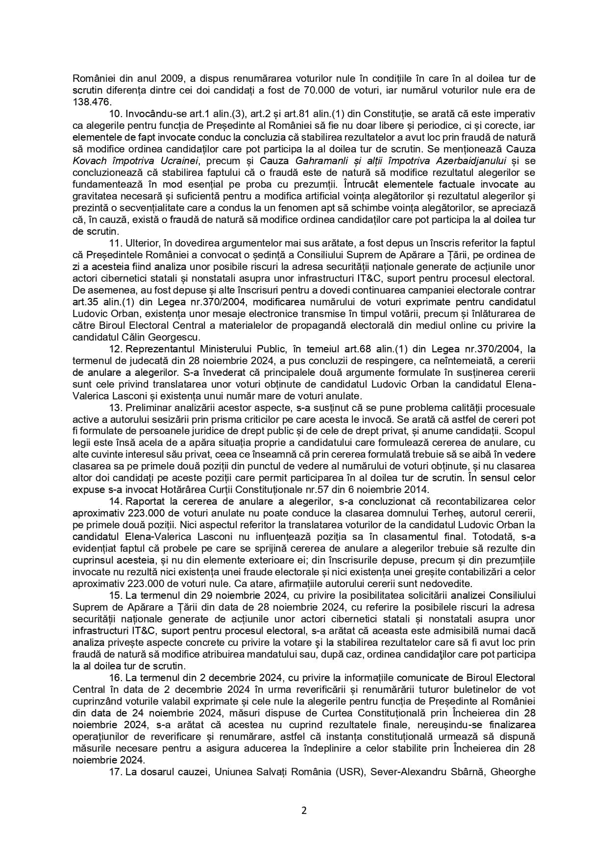 Terheș reported several irregularities. The first concerned the illegal continuation of the electoral campaign online on November 23-24, including on election day. The second involved the use of bots and automated mechanisms to promote candidate Călin Georgescu. The third referred to an alleged fraudulent transfer of votes from candidate Ludovic Orban to Elena-Valerica Lasconi in three polling stations. He also cited the existence of a disproportionate number of null votes (223,132) compared to the difference between candidates, as well as irregular voting on supplementary lists.