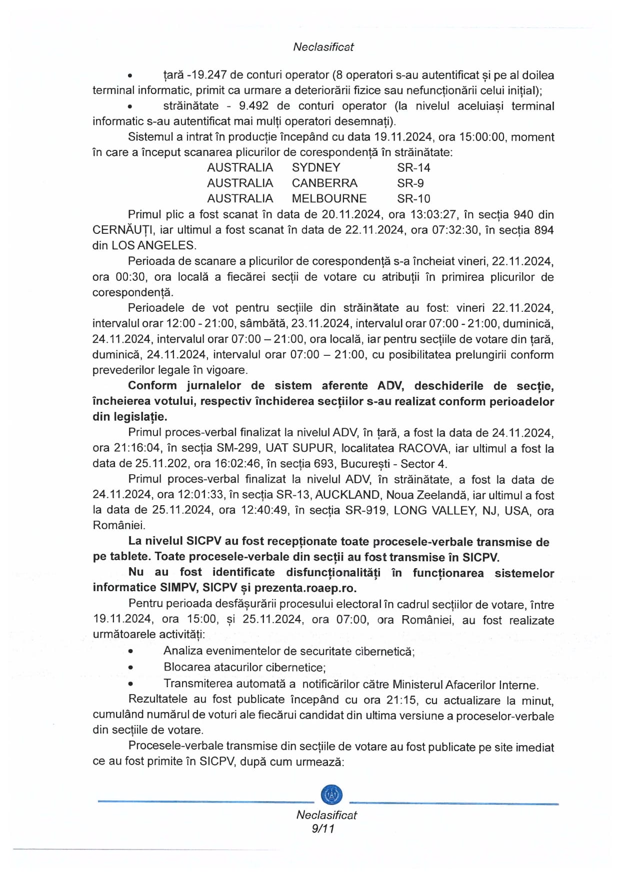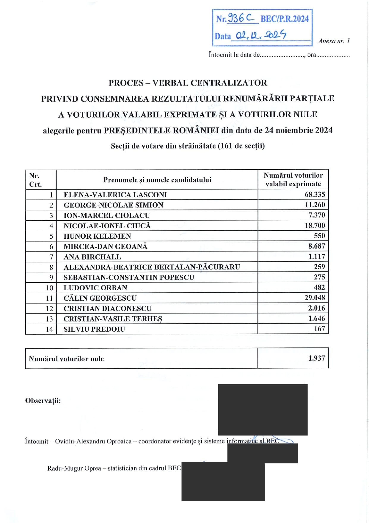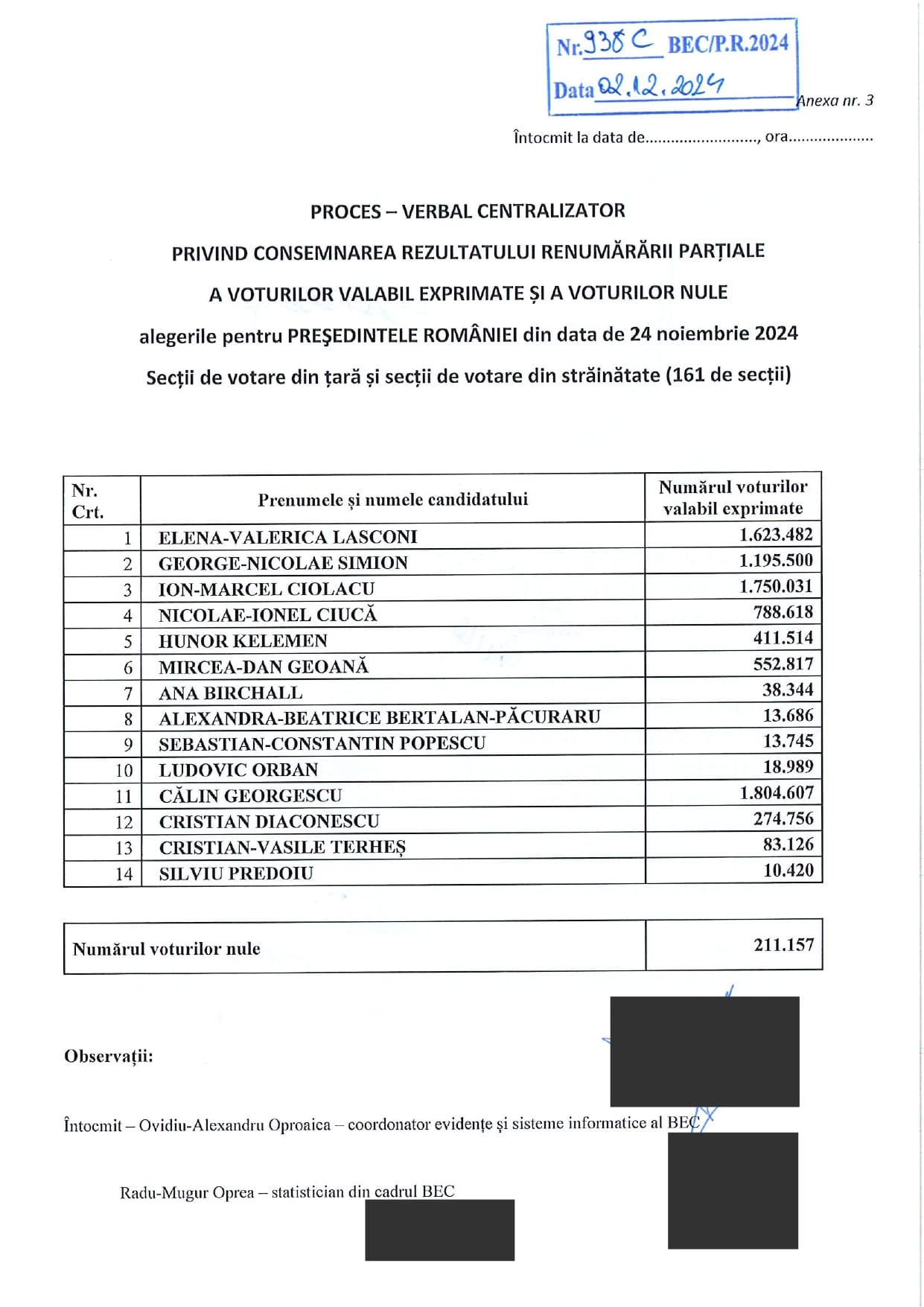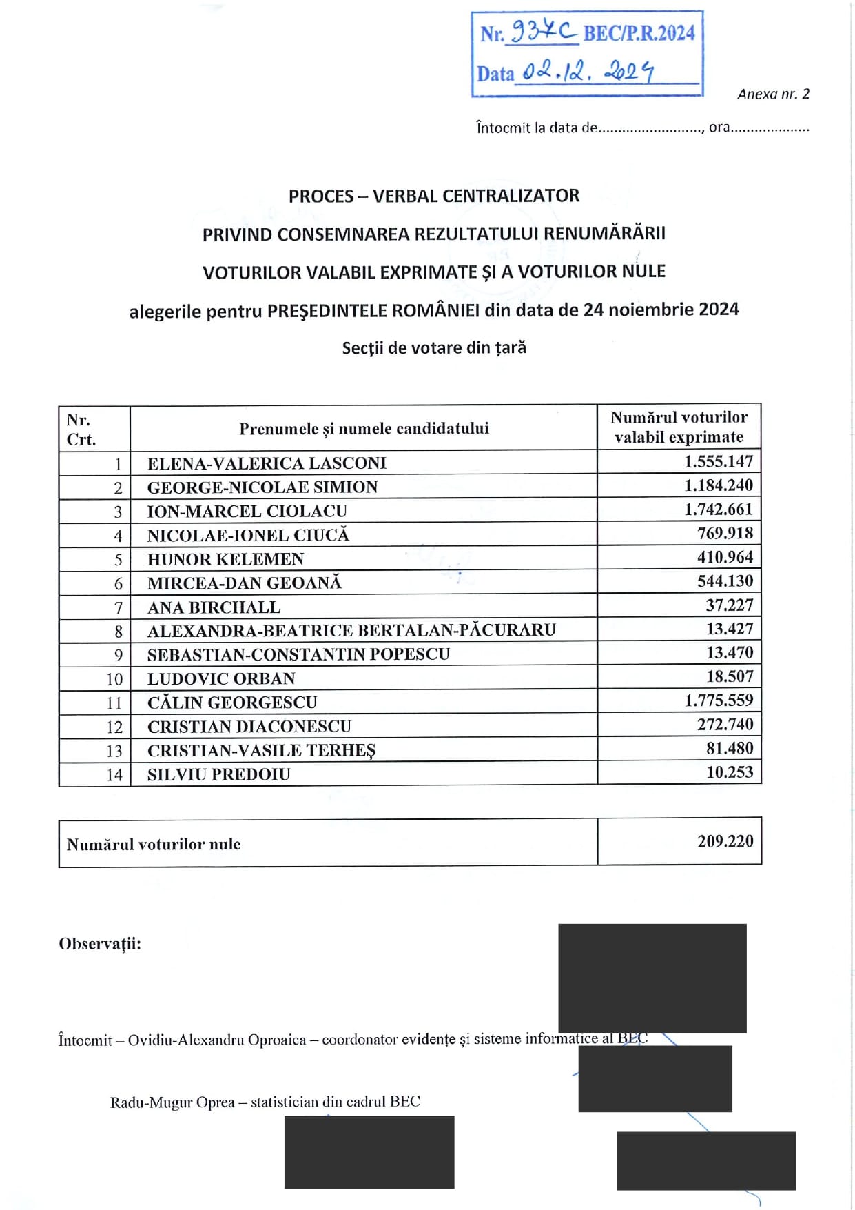 On November 26, BEC submitted to the Court the centralizing minutes along with all the minutes from the electoral offices. An examination of these documents revealed that out of the 18,021,800 registered voters on the permanent lists, 9,465,650 turned out to vote, with 9,242,186 valid votes and 223,132 null votes. Călin Georgescu received 2,120,401 votes, Elena-Valerica Lasconi 1,772,500 votes, and Ion-Marcel Ciolacu 1,769,760 votes.