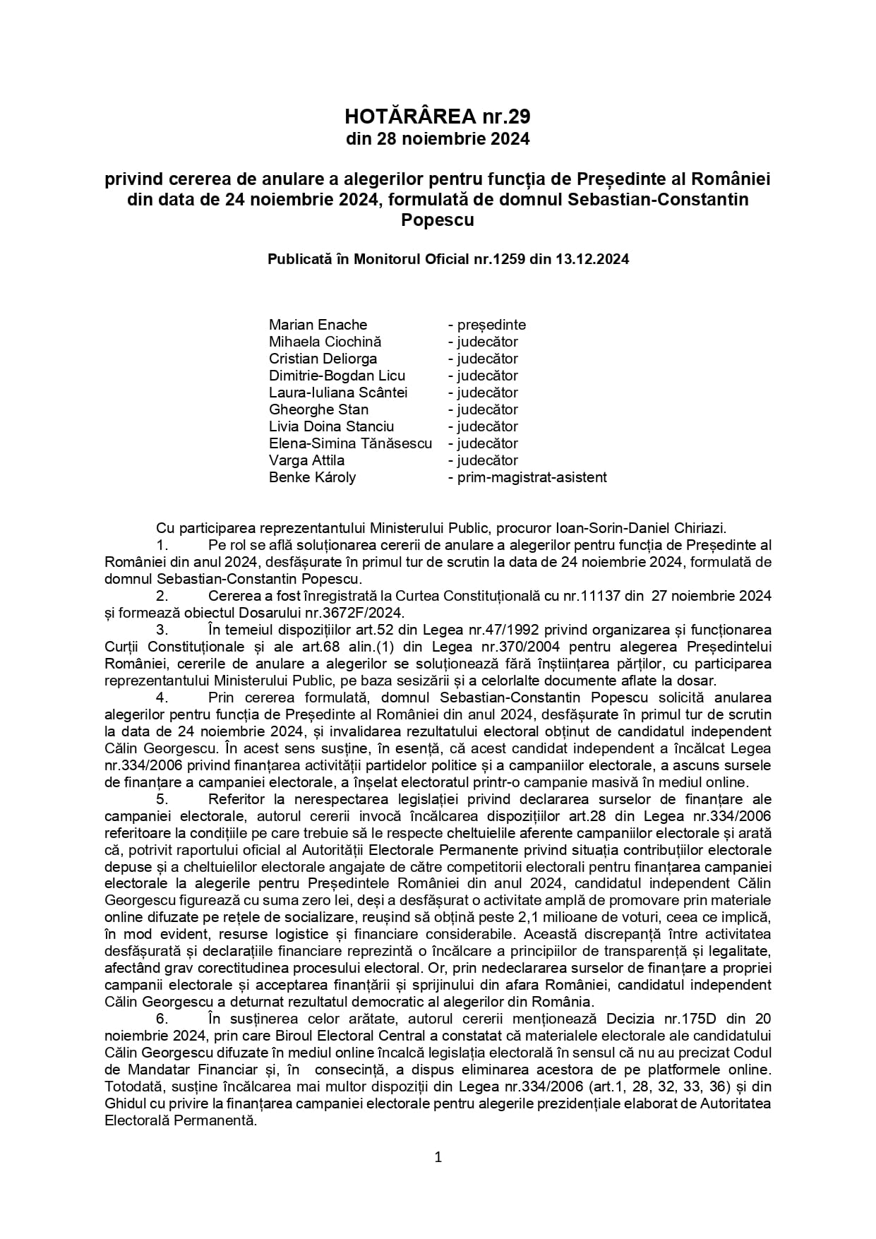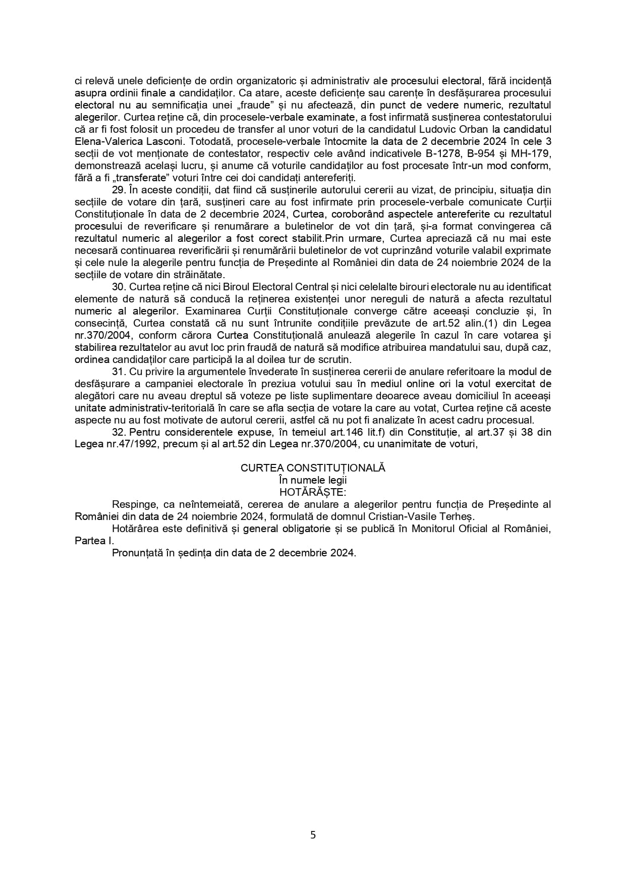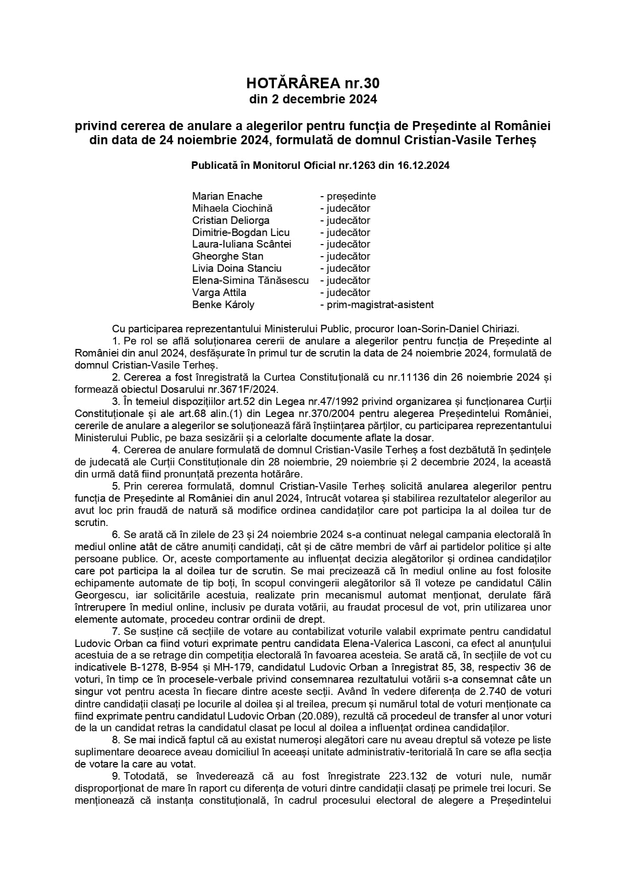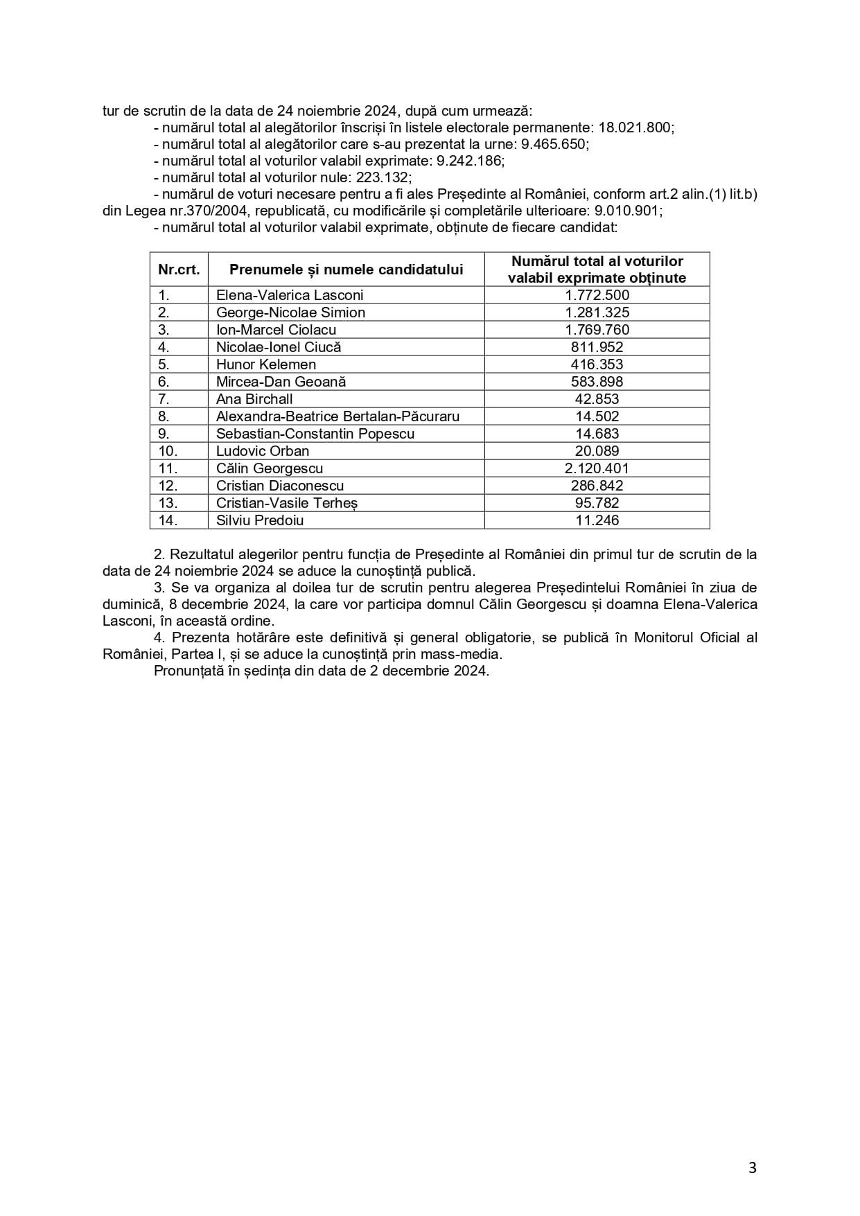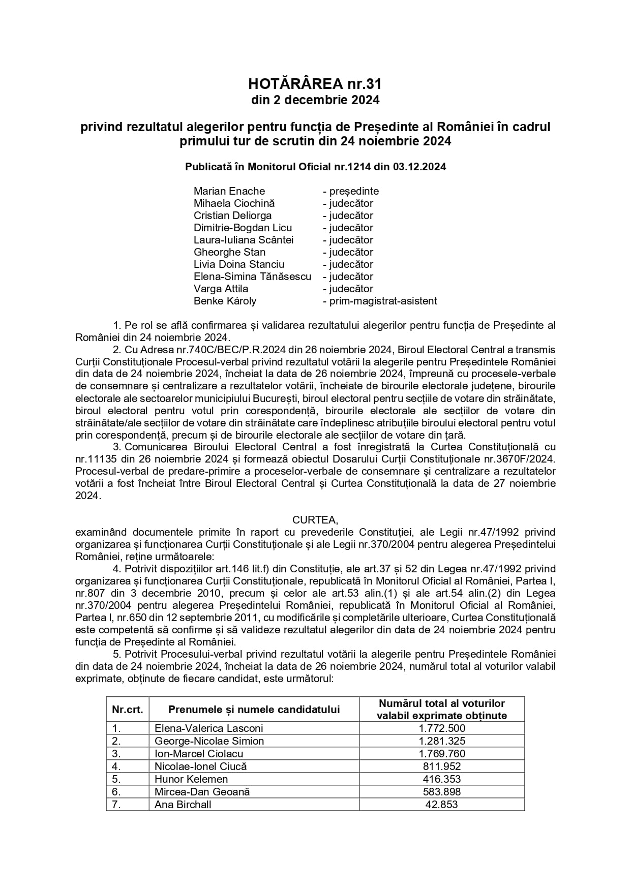 Decision 31/2024 validating the first round of the presidential elections, issued immediately after the rejection of Terhes's request, on December 2, 2024.
