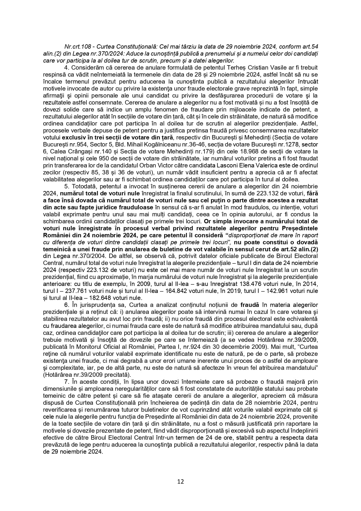 On November 26, 2024, Cristian-Vasile Terheș submitted a request to the Constitutional Court to annul the first round of the presidential elections held on November 24, 2024. The challenger, who received 95,782 votes (1.04% of the total valid votes cast), alleged the existence of electoral fraud that would have altered the order of candidates for the second round.
