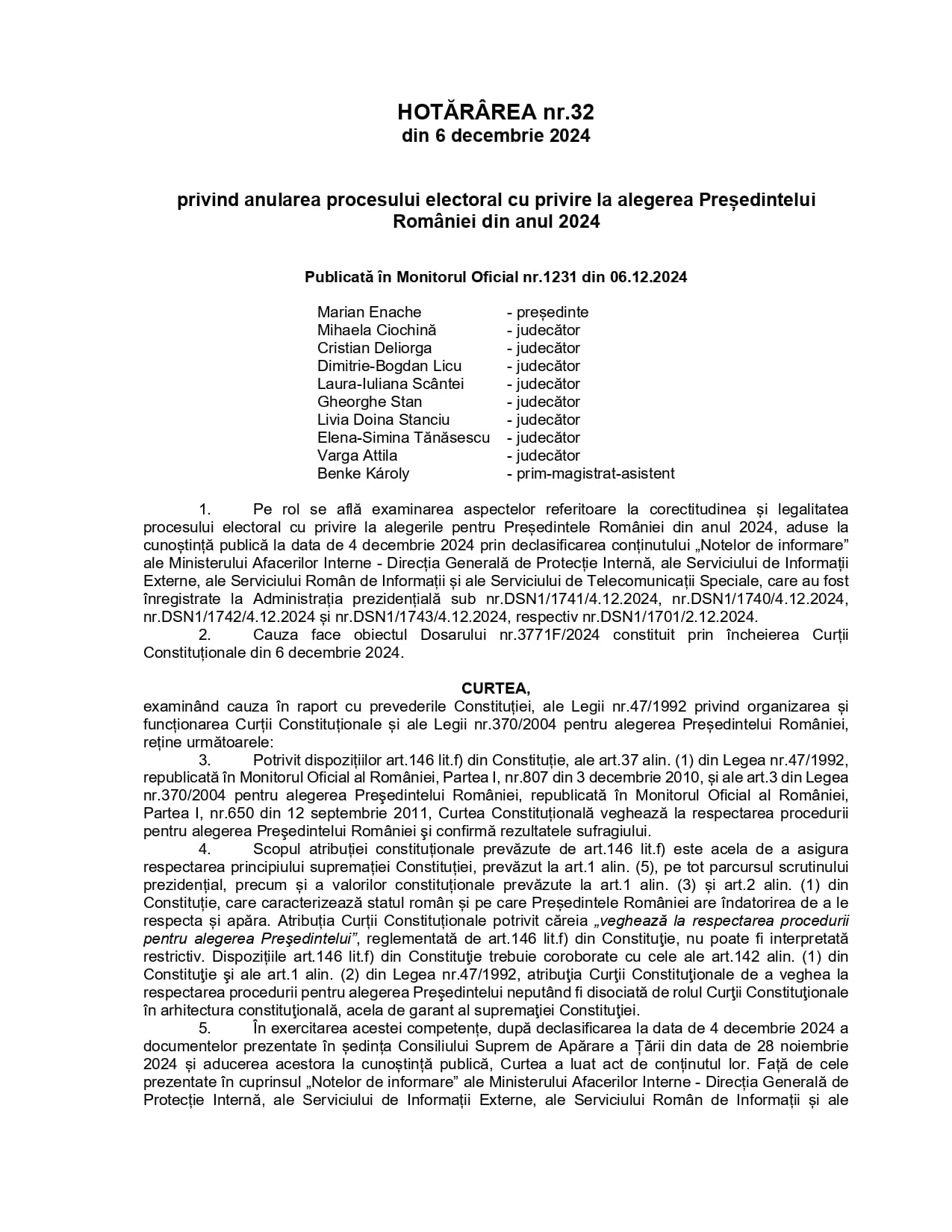 The decision no. 32/2024 of the Constitutional Court of Romania (CCR) represents an unprecedented ruling in the post-December history of the country, which ordered the complete annulment of the presidential elections of 2024.