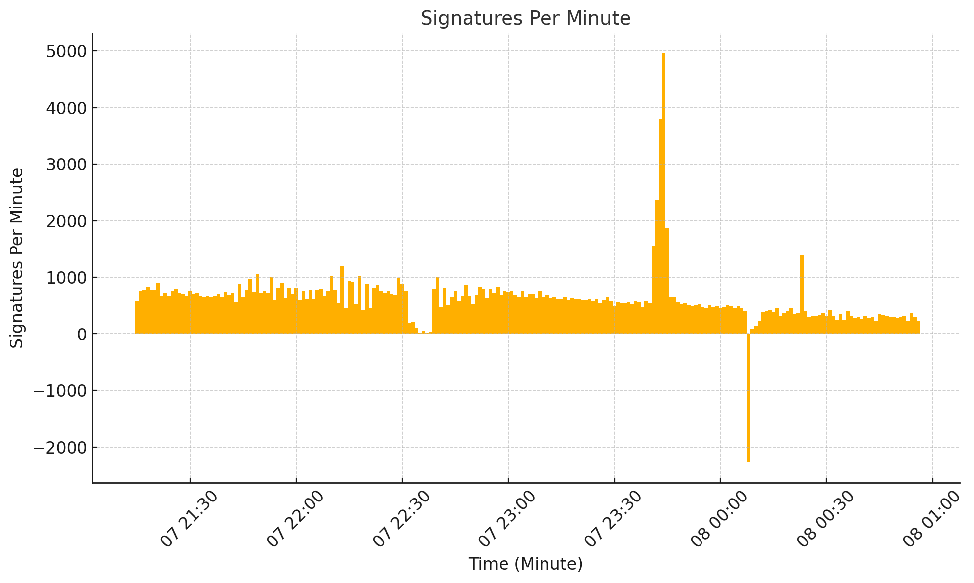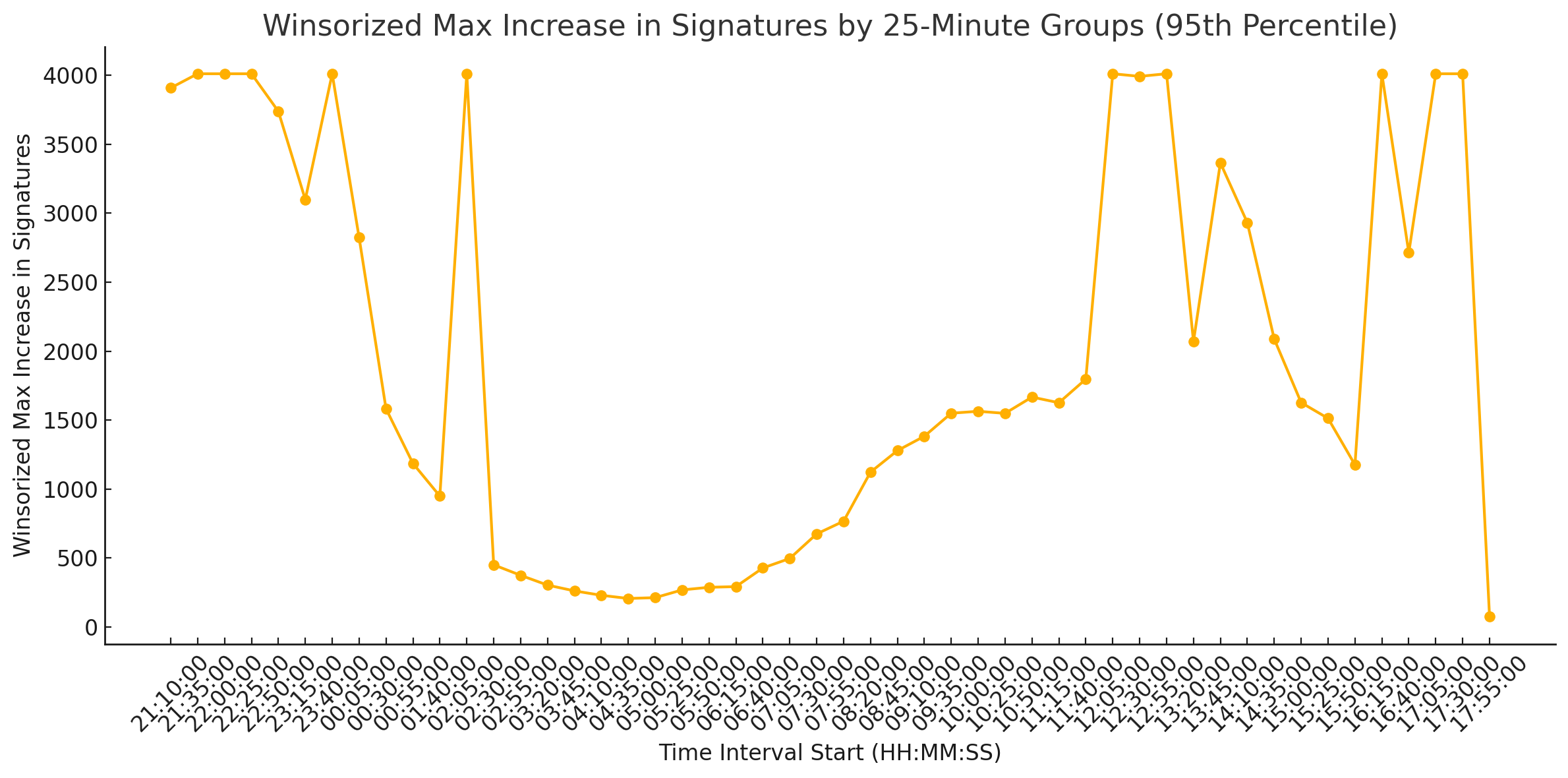 At a minute level, it can be observed that there is a clear variability in the number of signatures from minute to minute, with natural peak periods, etc.