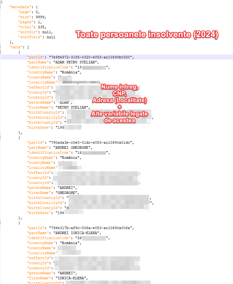 The endpoint /bpi-published-persons/pf dezvăluie CNP-urile tuturor persoanelor fizice în stare de insolvență, alături de nume și prenume, la o simplă interogare cu o vocală.