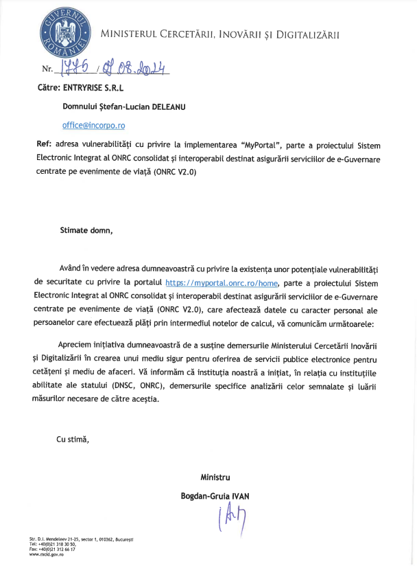 An encouraging response also came later from MCID, which has started to get involved in resolving the issues of the MyPortal.ONRC.ro platform.