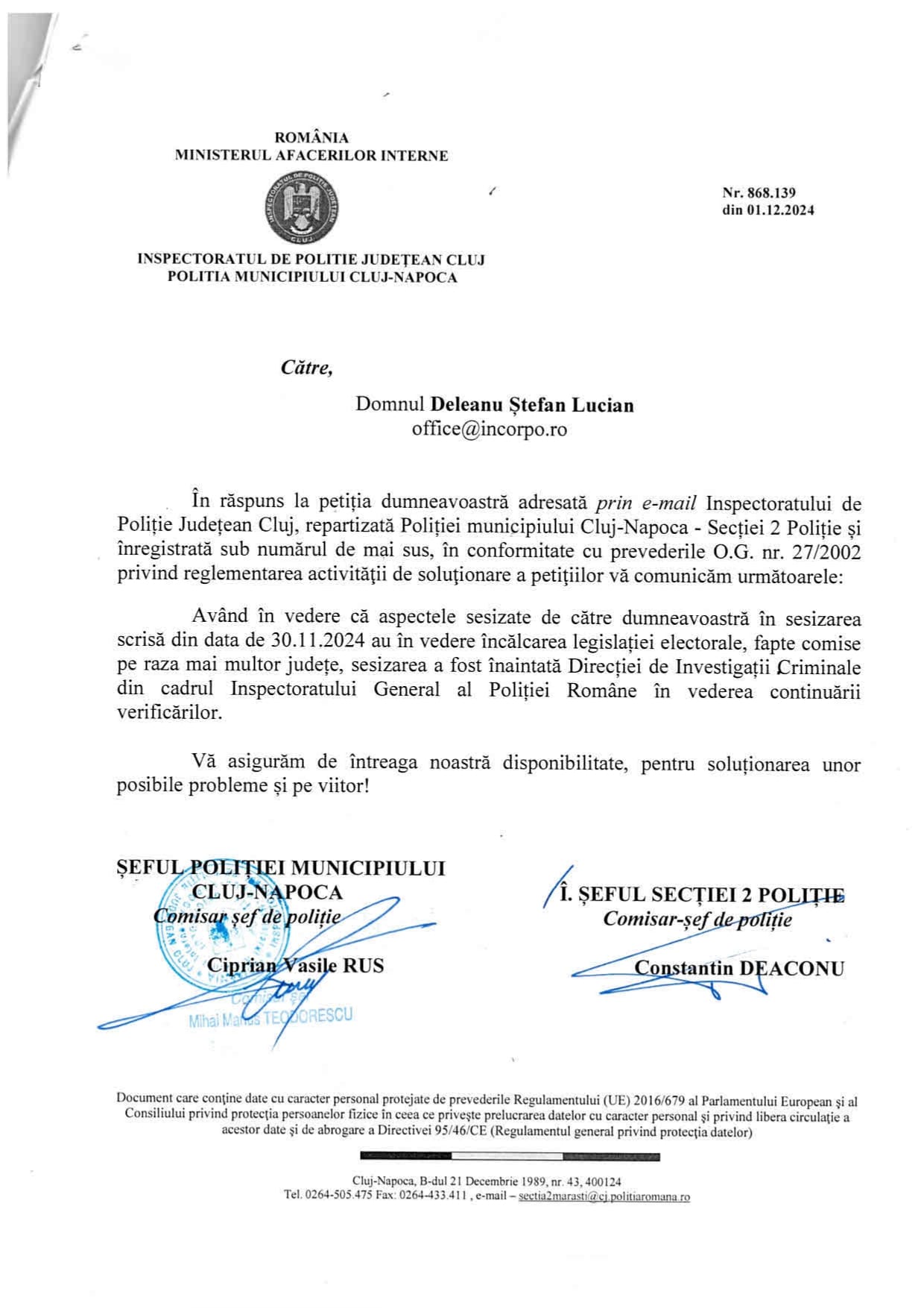 After mistakenly arriving at their location, she proceeded to the Cluj Police Inspectorate.