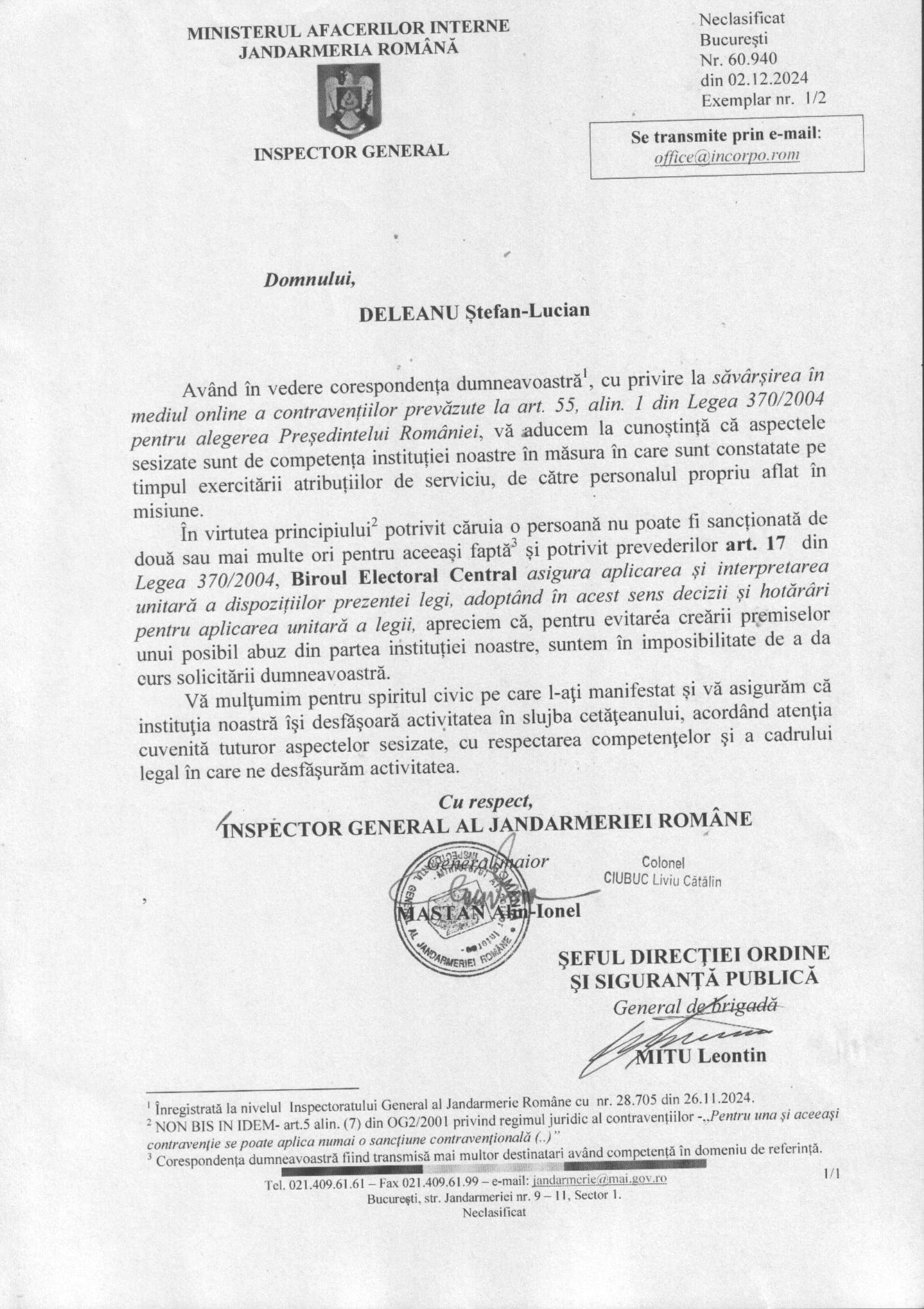 Since both the Romanian Gendarmerie and the Romanian Police have been notified (for strategic reasons, to prevent disappearance), they stated that the Romanian Police would be more capable of handling the request and conducting the investigation.