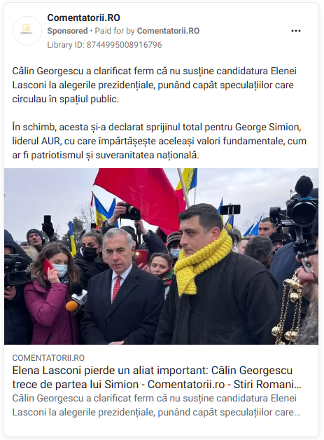 Neutral advertising about Calin Georgescu including many forms of propaganda suggesting that he has withdrawn his candidacy in favor of him George Simion.