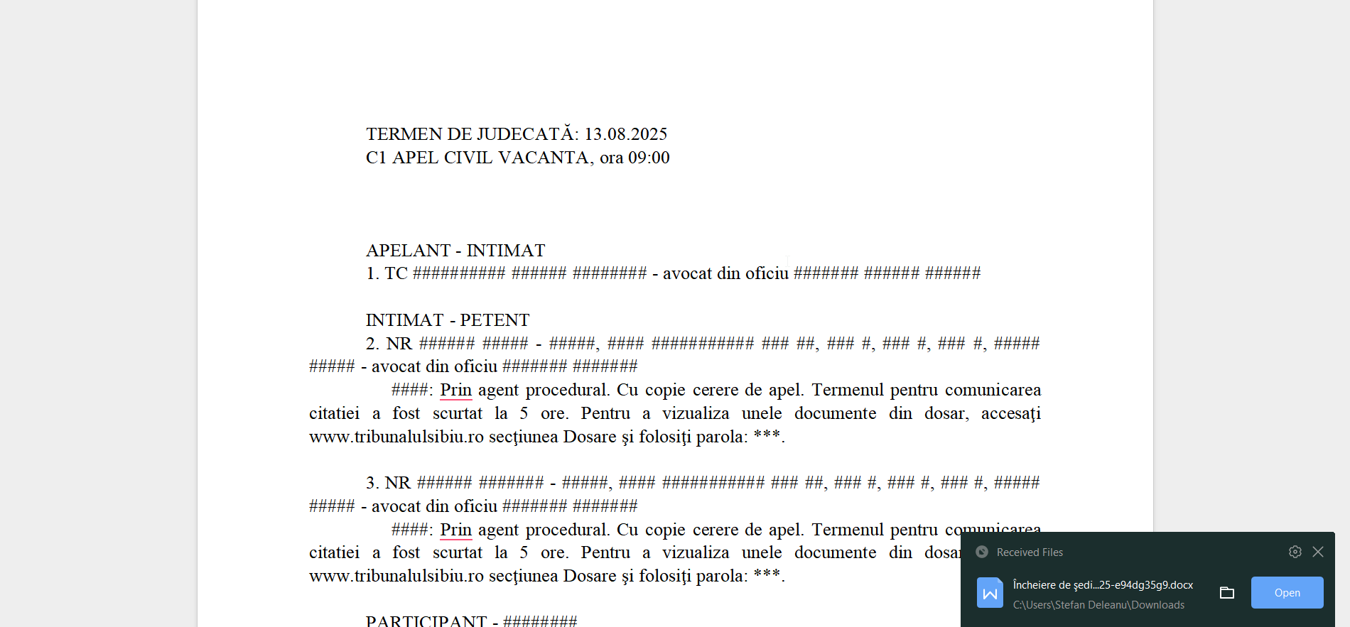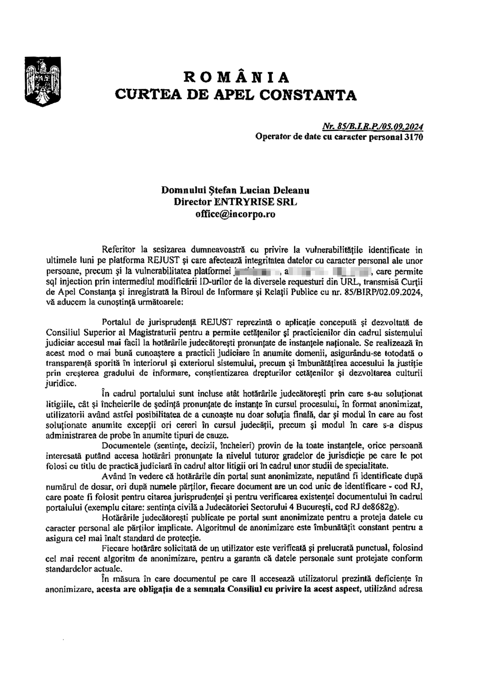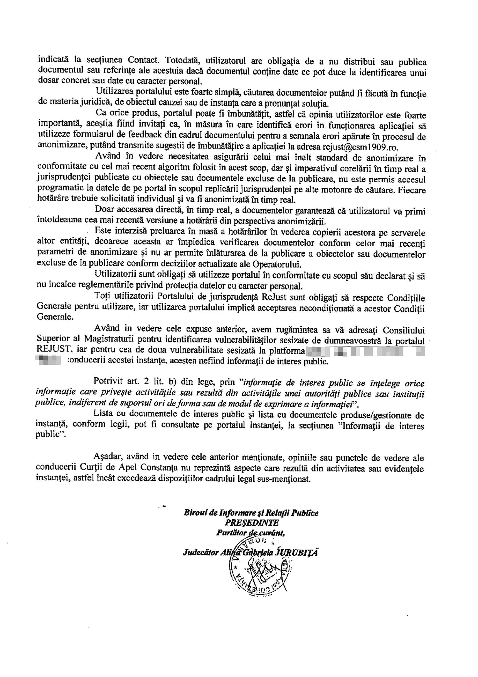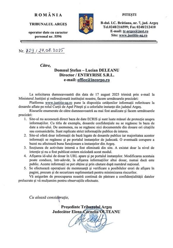 The Court of Appeal Constanta has requested that we communicate the vulnerable aspects to the authorities, stating once again that anonymization by name is sufficient to protect the case number.