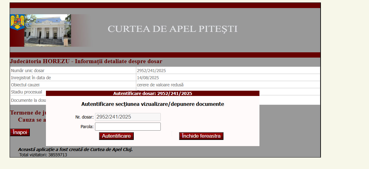 It is evident that the term without a user (in this case, the case number is unnecessary), but this aspect can be easily rectified if we consider that: a) the number of cases in a specific court, with a specific subject, on a specific date is under 10, even in the busiest courts. b) The dosare.just.ro system allows advanced searches using an API, and most case search tools now also permit advanced searches.
