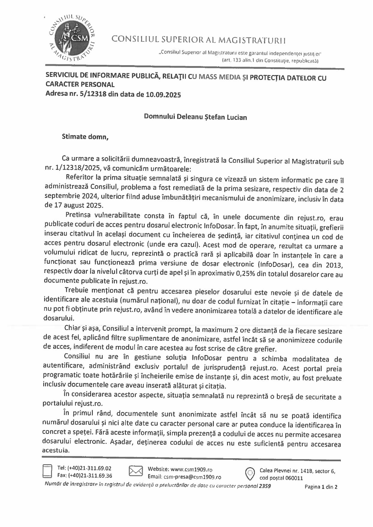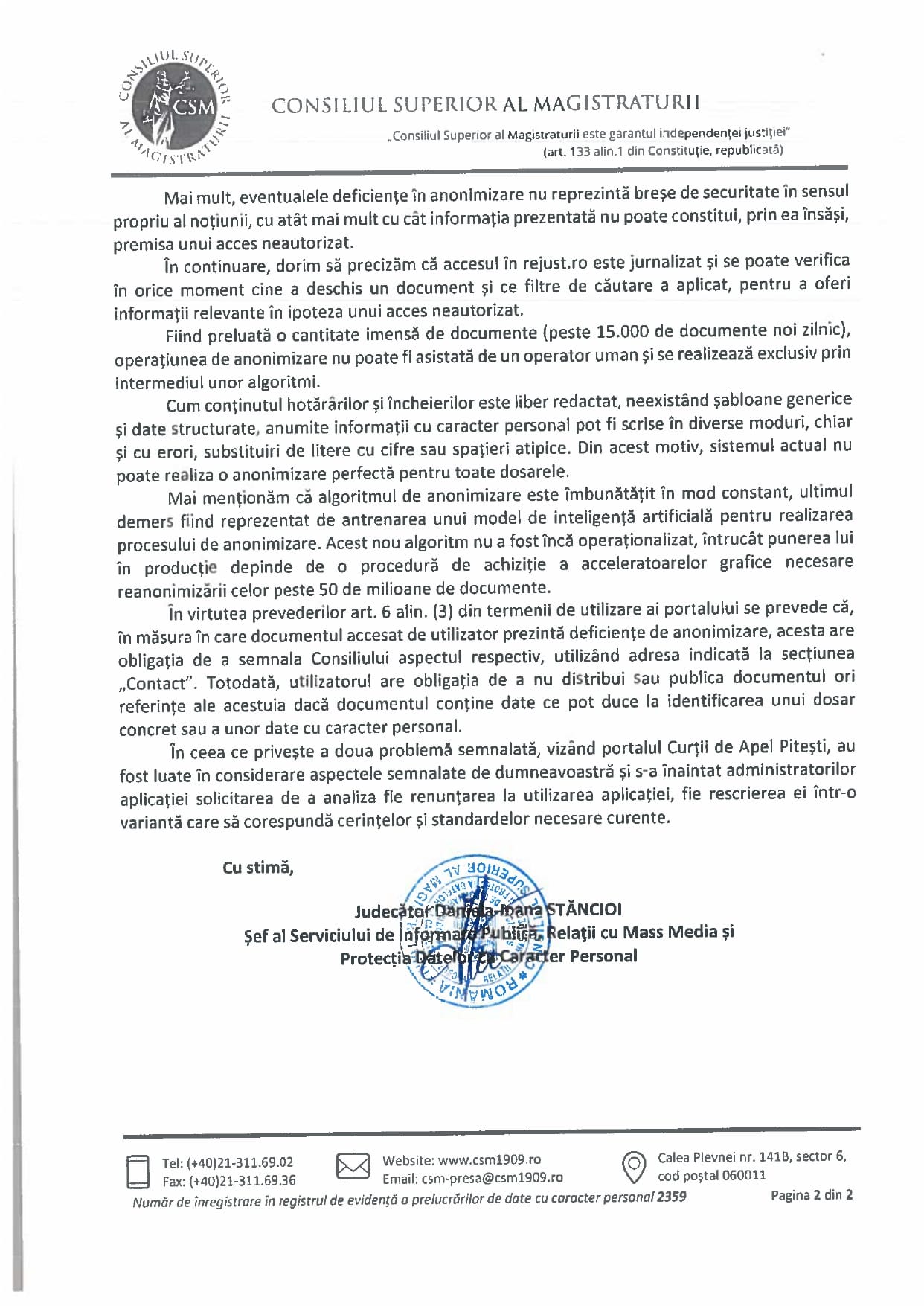 ANSPDCP has communicated to us that it is not the authority responsible for overseeing and sanctioning any potential data breaches by the judiciary, as this role belongs to the CSM. The CSM has not self-sanctioned, preferring to conceal the issue and not apply the GDPR regulations.