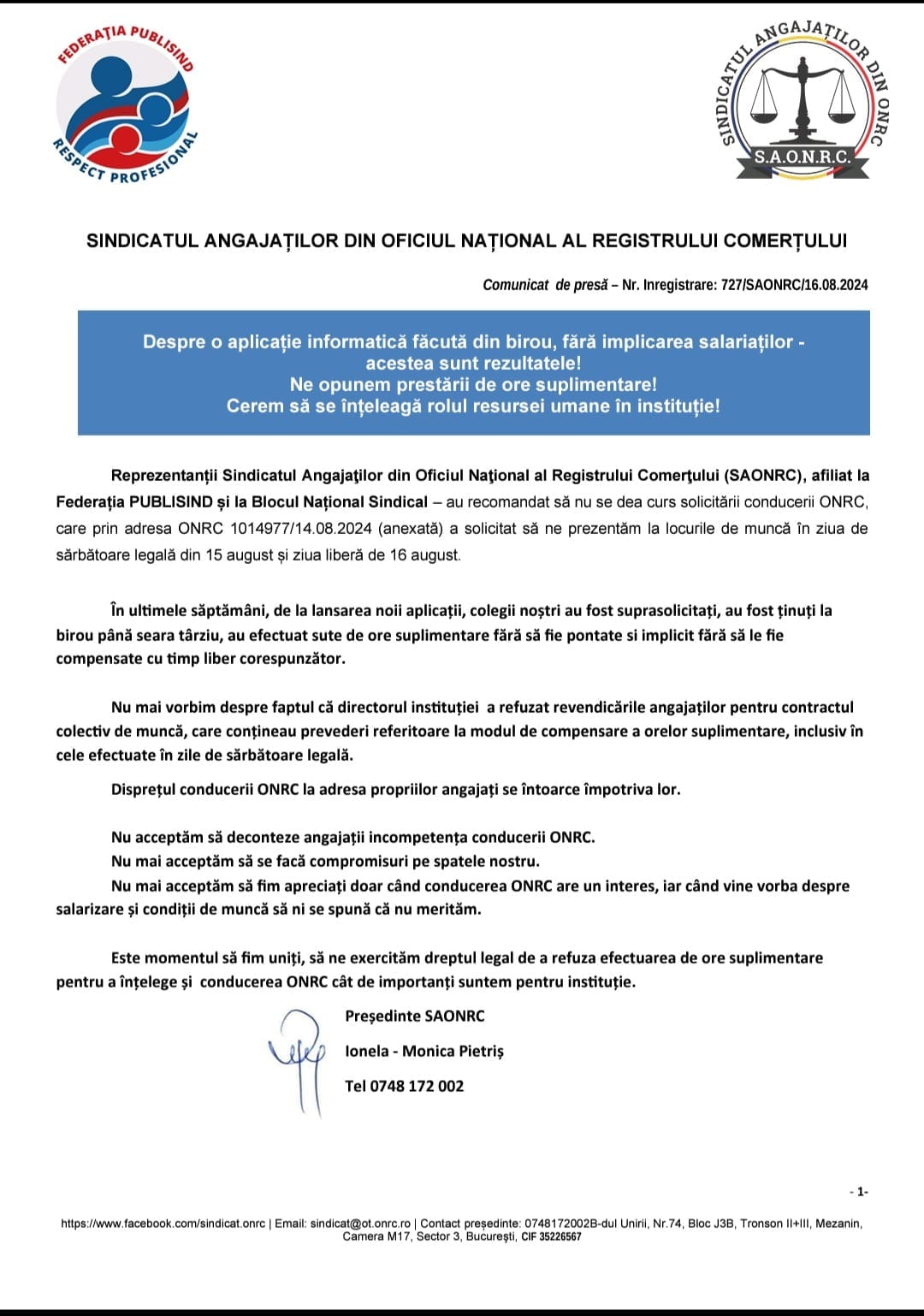 The ONRC Directorate kindly requests that anyone interested contact the litigation department (Mr. Burdescu) during business hours.