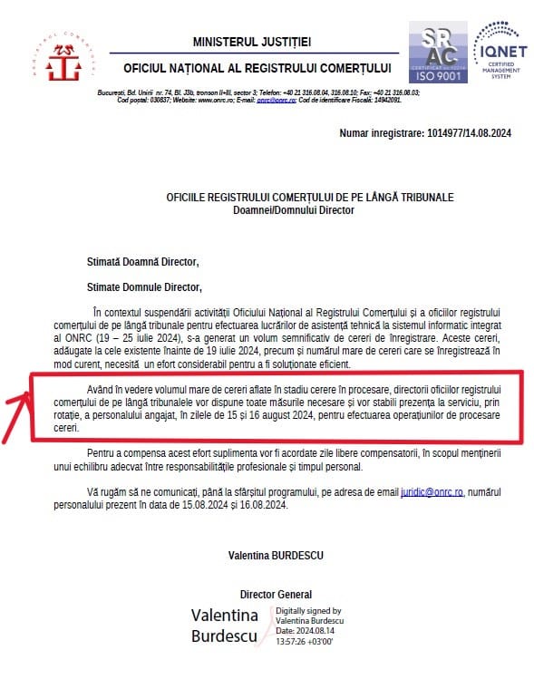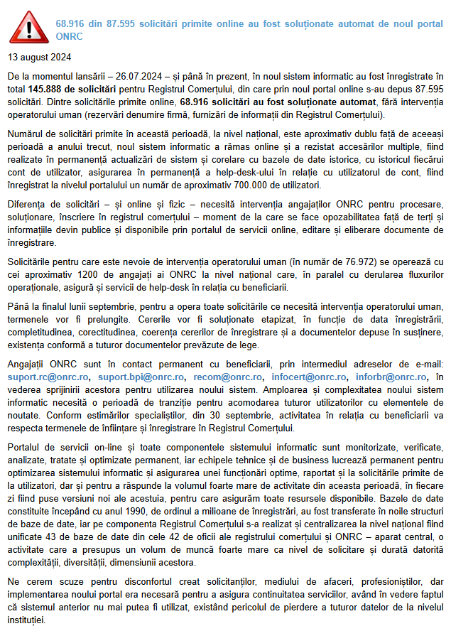 In the context of the suspension of the National Trade Register Office and the trade register offices attached to the courts for technical assistance work on the integrated IT system of the ONRC (July 19 โ 25, 2024), a significant volume of registration requests has been generated. These requests, combined with those existing before July 19, 2024, as well as the large number of requests currently being registered, require considerable effort to be resolved efficiently.